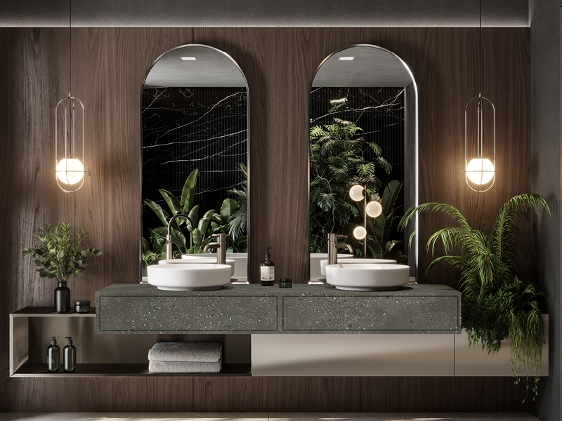 צבעוניות מתפרצת נצפתה גם בחדרים הרטובים עם ארונות אמבטיה בגוונים שולטים של טורקיז, אפרסק סלומון, חמרה, טרקוטה וענבר, המון ירוקים – כמו מרווה וירוק זית - וגווני פסטלים עדינים.