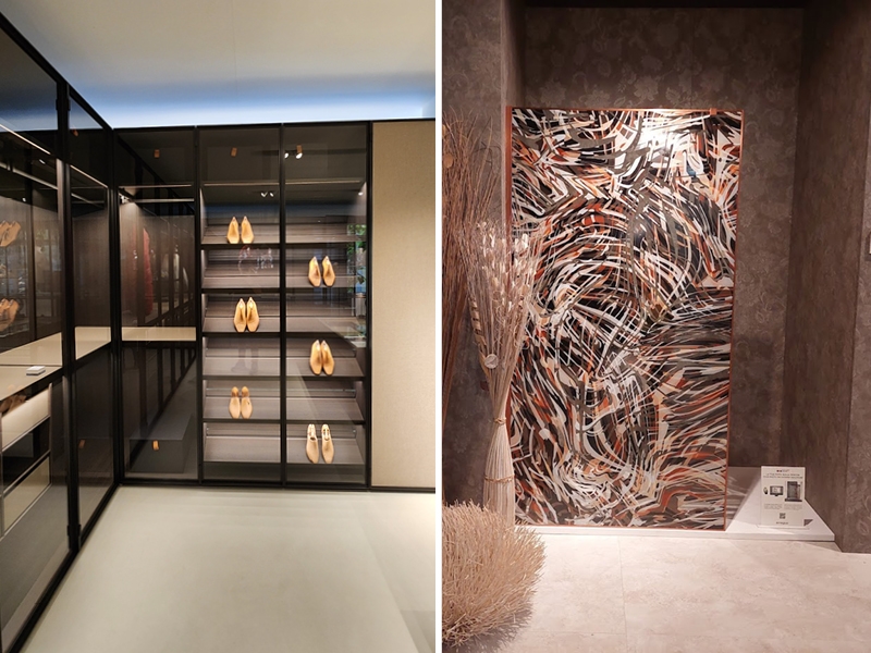 מגוון זכוכיות שקופות, חצי שקופות ואטומות ליצירת משחקי שקיפויות ולהדפסות, Salone del Mobile.