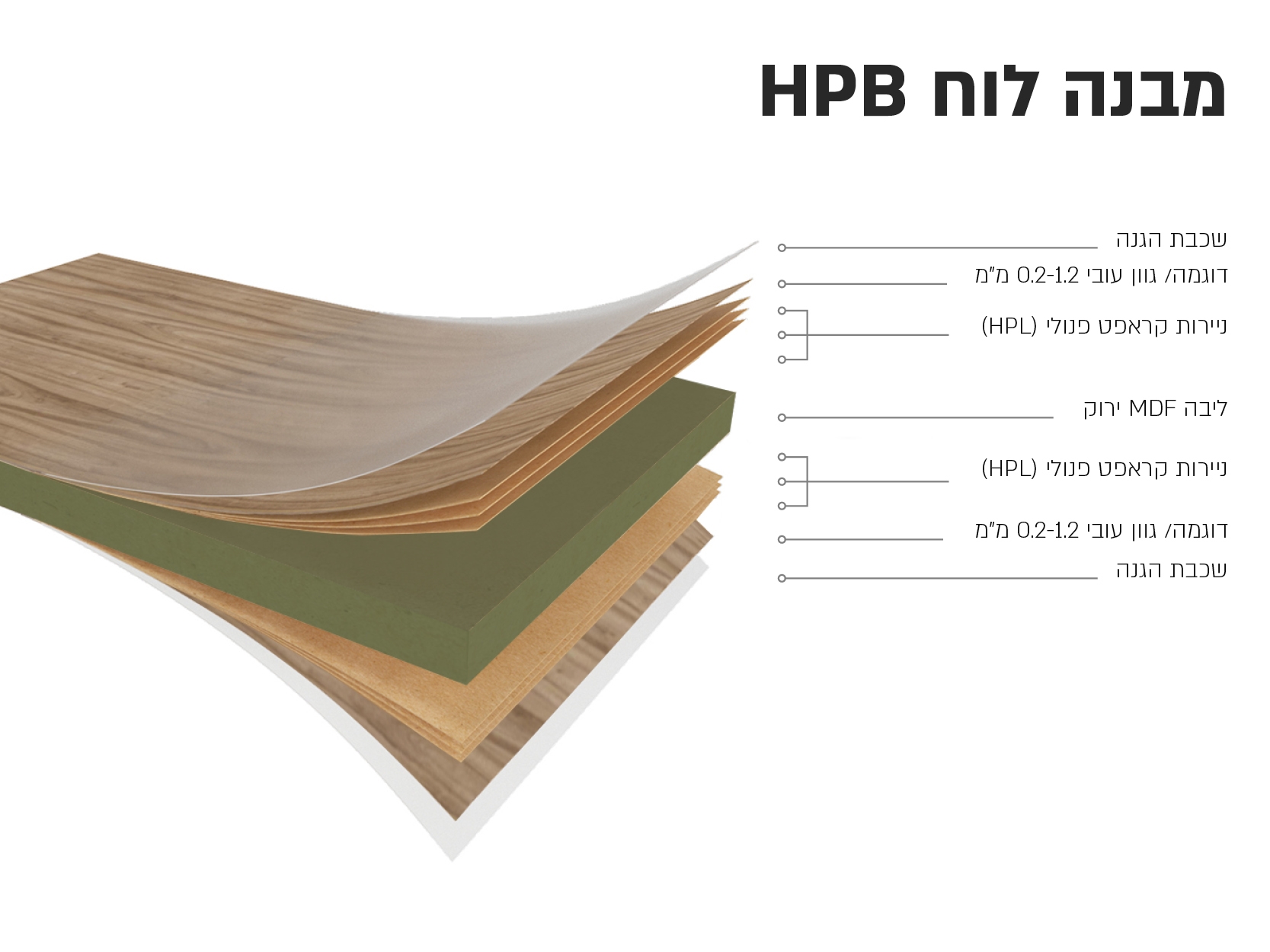 לוח HPB (High Pressure Board) הינו לוח מובנה דו-צדדי, המיוצר בכבישה אחת של חומר ליבה MDF ירוק עם HPL (פורמייקה) משני צדדיו והוא המילה האחרונה בתעשייה בשל כל היתרונות הבאים: