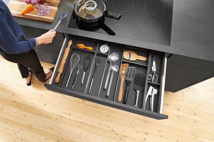 מערכות המשלבות סדר ועיצוב בתוך המגירה. בתמונה: מערכת אמביה-ליין מבית BLUM למגירות לגראבוקס