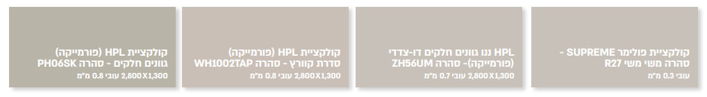 לפרטים נוספים היכנסו לעמוד הקולקציה של כל חומר, לחצו על הדגם הנבחר, צפו באינדקס ההתאמות שלו, ראו המחשה של לוח מלא, קבלו מידות לוח, ערכו הדמיות ב'עצב את הדלת' והזמינו דוגמאות עד הבית.