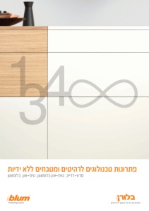 2 תוכן רעיון לרהיטים ללא ידיות 1 5 יישומים: 3 6 - מנגנוני הרמה (קלפות) - דלתות (צירים) - מגירות טכנולוגיות תנועה: 4 7 )9( - סרוו-דרייב )12( - טיפ-און בלומושן )14( - טיפ-און )16( - בלומושן עיצוב בקווים ישרים ומדויקים 19 שימושי ונוח - החופש בתנועה 19 אינסוף אפשרויות 20 הרכבה נוחה ומדויקת 25 מידע מקצועי לתכנון 27 BLUM 30